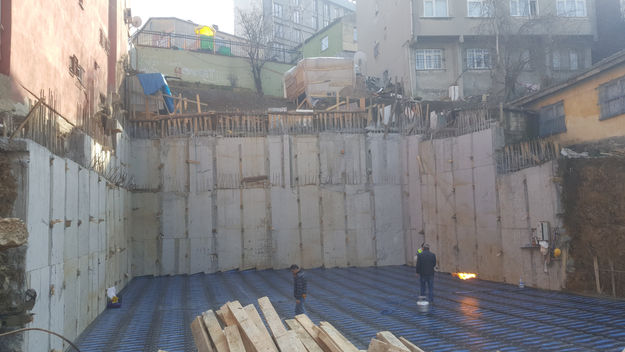 - Taksim GÖLDAĞI otel projemizi sizlerle paylaşmak istedik. Projemizde toplamda 27 adet kuyu temel imalatı yapılmıştır. Kuyuların uzunluğu 3m genişliği 2m derinliği 14m civarı olarak değişmektedir. Kuyuların imalatı yaklaşık olarak 3 ay gibi bir zamanda tamamlanmıştır. Çevre kuyularının imalatı ile mevcut binayı sağlama alındıktan sonra ortada asansör ,merdiven boşluğu ve kolon kuyularının imalatı yapılmıştır. Kuyu temel imalatından sonra kuyu temel perdeleri 0 kotuna kadar çıkartılmıştır. Kuyu temel imalatı ile yapılmış olan asansör perdesi ,merdiven boşluğu perdesi ve 2 adet kolon kuyusu +2. kata kadar çıkartılmış ve +2. kattan itibaren tabliye betonları dökülerek -4. kadar inilmiştir. Şantiye alanında bulunan ortada kalan hafriyat da -1. tabliye betonu dökümü tamamlandıktan sonra -2.kata kadar alınmış ve -2. kat tabliye betonu döküldükten sonra tabana kadar hafriyat alımı tarafımız tarafından tamamlanmıştır.